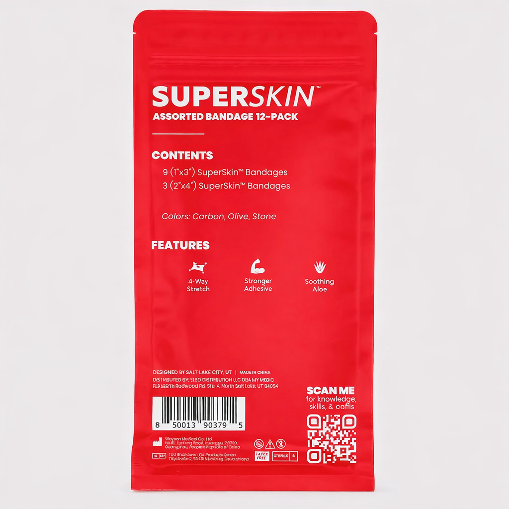 Bandages made for treating minor cuts or scrapes. Made with SuperSkin technology for utmost comfort, protection, and healing. Each sterile bandage features a soothing aloe pad for fast healing. SuperSkin materials are 5x stronger than the average bandage adhesive. Experience the best bandage you’ll ever use!